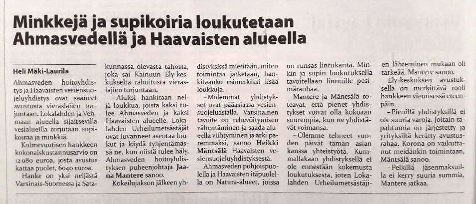 Artikkeli Vakka-Suomen Sanomissa pienpetopyydystyksestä